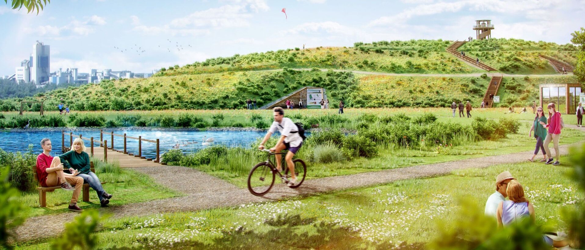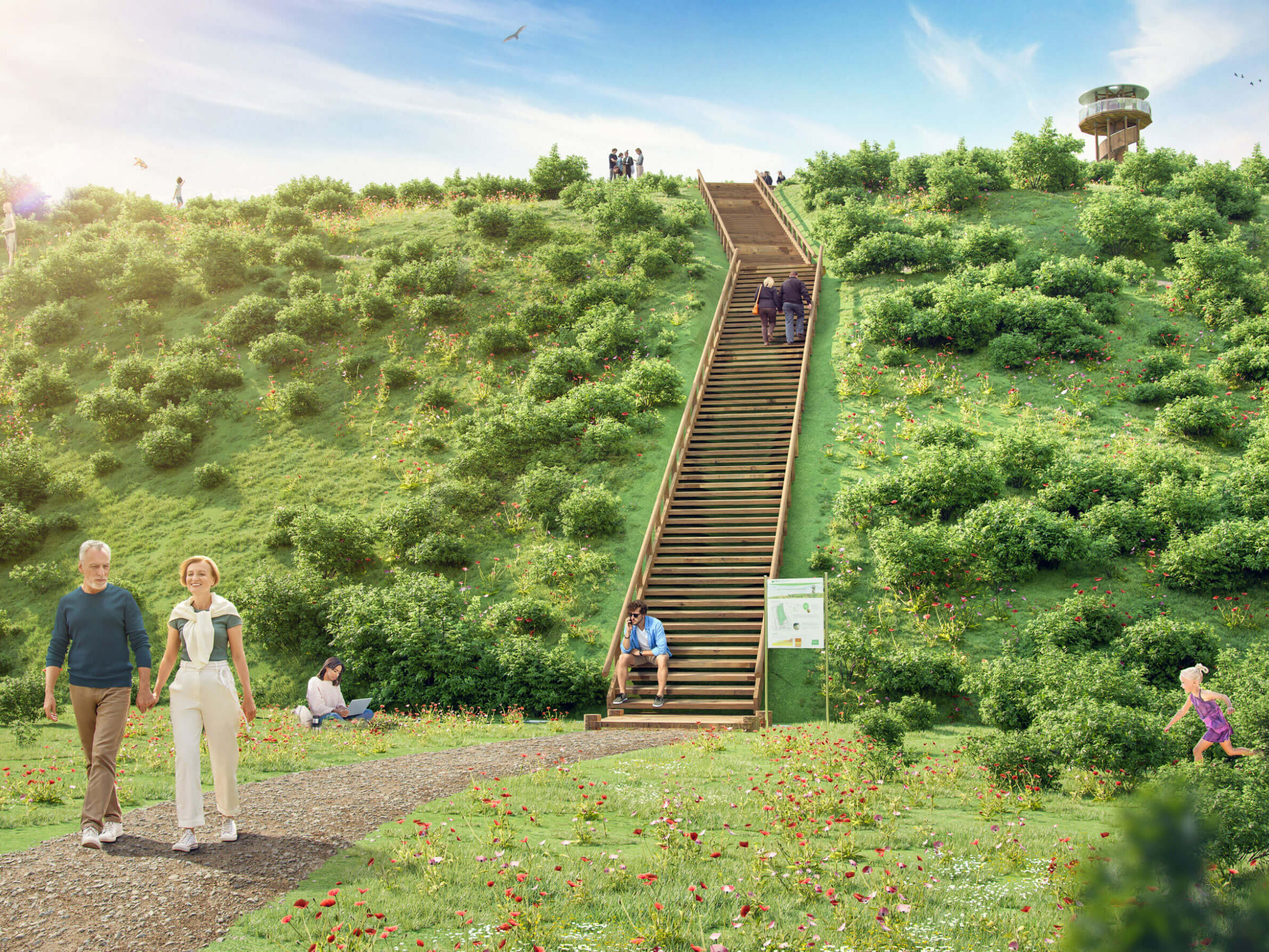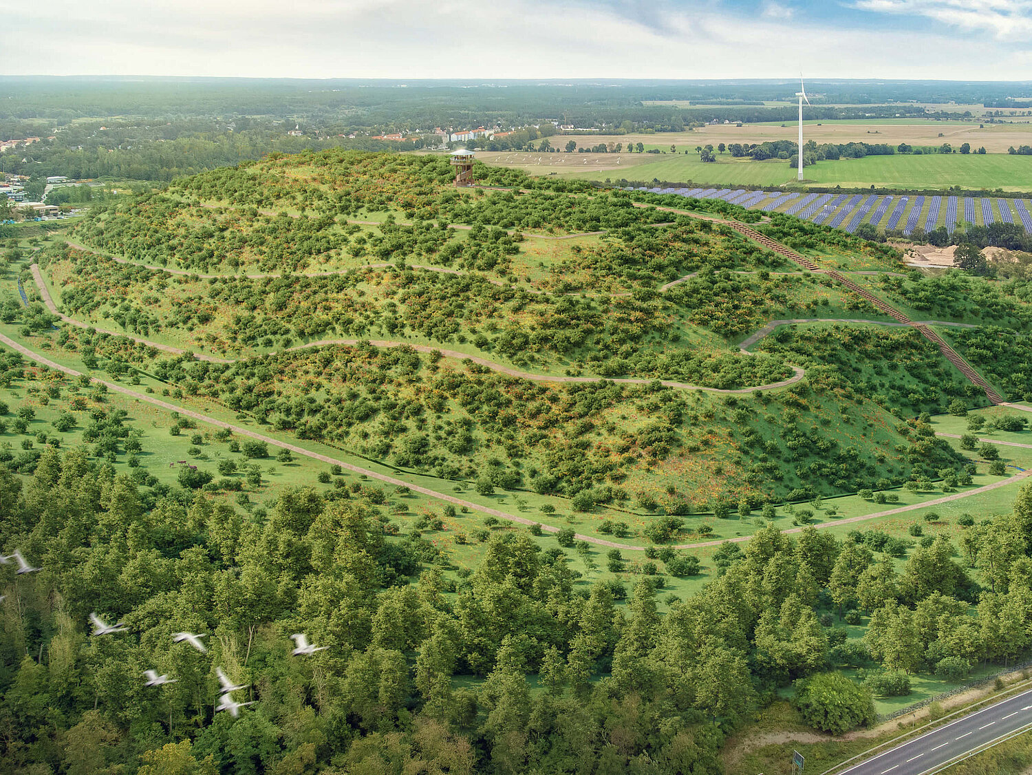 Entspannendes Spazierengehen, Mountainbike-Abenteuer, eine Himmelstreppe und ein Aussichtsturm – der Natur- und Freizeitpark Herzfelde bietet Freizeitmöglichkeiten für die ganze Familie. Mehr noch: Vom „Rüdi“, einem Aussichtsturm auf dem geplanten Berg, haben Besucher später einen atemberaubenden Fernblick.