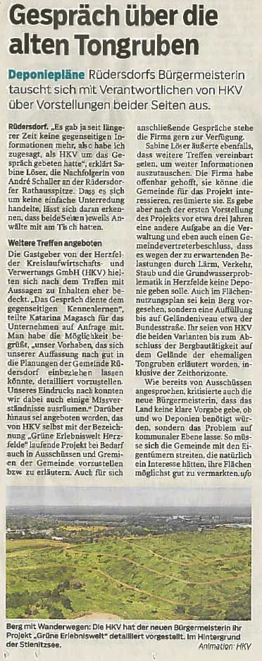 Die ,Märkische Oderzeitung' berichtet über ein Gespräch zwischen der Bürgermeisterin der Gemeinde Rüdersdorf Sabine Löser und Vertretern der HKV zum Projekt ,GRÜNE Erlebniswelt Herzfelde'.
