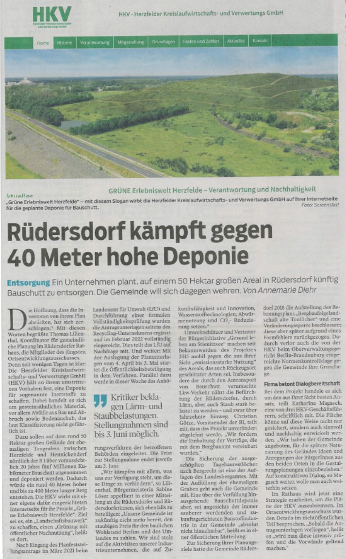 Die ,Märkische Oderzeitung‘ berichtet über die Einreichung des Planfeststellungsantrages für das Projekt ,Grüne Erlebniswelt Herzfelde‘ und die Reaktionen der Gemeinde Rüdersdorf sowie der Bürgerinitiative ,Gesund Leben am Stienitzsee‘ hierauf.