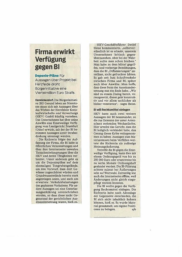 Die ,Märkische Oderzeitung' berichtet über die Auseinandersetzungen zwischen der HKV und der ,BI Gesund Leben am Sienitzsee'.